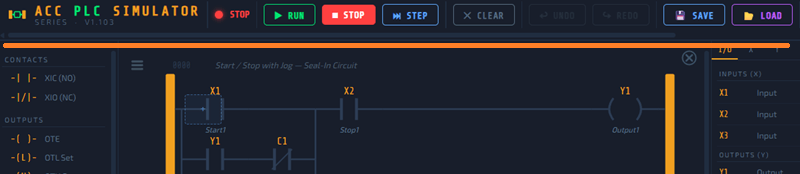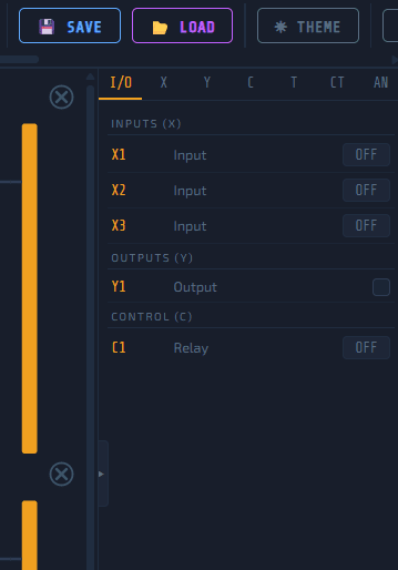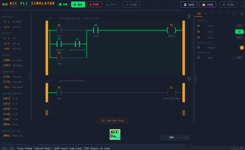 Inputs (X) can be toggled manually in the I/O panel or driven by a connected 3D scene. Outputs (Y) are controlled by your ladder logic. Internal relays (C) are used for intermediate logic — they don’t connect to anything physical but are essential for organizing complex programs.