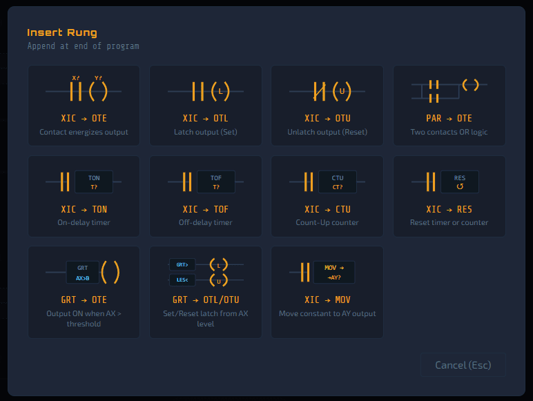 I built this simulator so that anyone learning PLC programming can get hands-on practice without needing hardware. It uses standard PLC register conventions that you’ll find across many different PLC brands. If you can program in this simulator, you can program a real PLC.