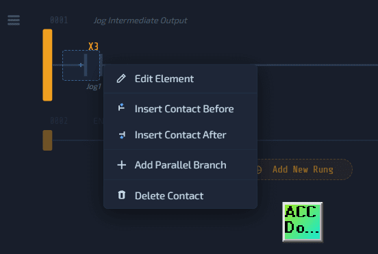 Parallel branches: Right-click on a contact to add a parallel branch. This is how you create OR logic — if any branch has power flow, the output energizes.