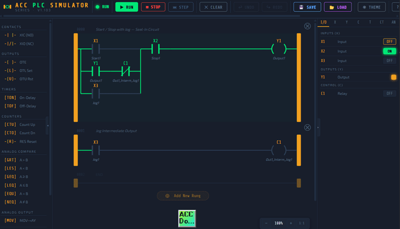 The ACC PLC Simulator is a free, browser-based ladder-logic editor and PLC scan engine. There is nothing to download or install. You open it in Chrome, Edge, or Firefox and start programming immediately.