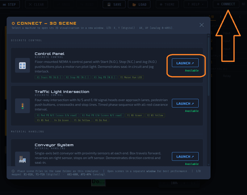 CONNECT – Opens the scene connection panel. This is how you link the simulator to a 3D scene like the Control Panel or Conveyor. More on this below.