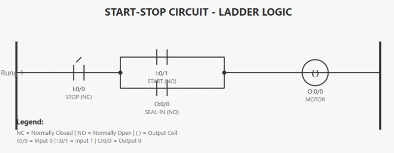 - Press START: Closes I:0/1, energizes O:0/0 (motor runs), and the O:0/0 seal-in contact closes to maintain the circuit
