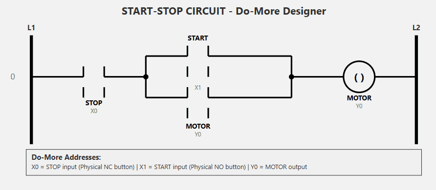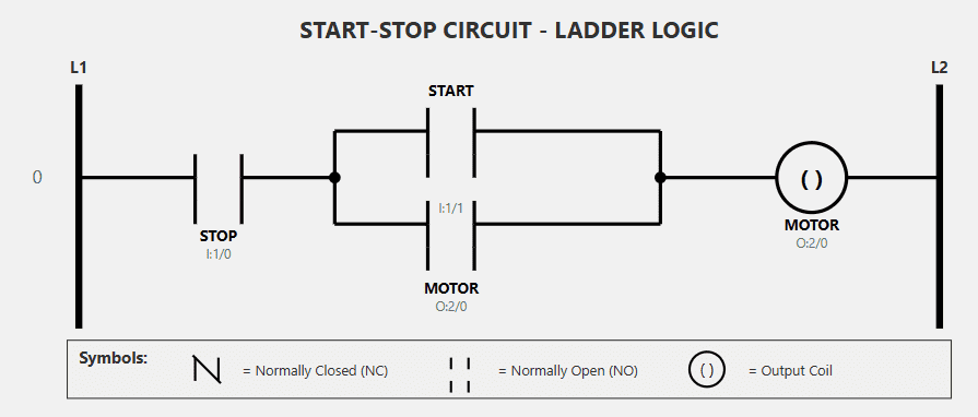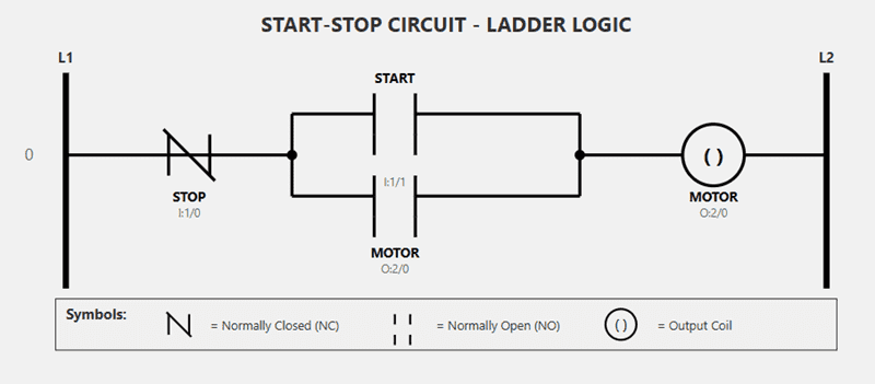 - Starting: When you press the START button (I:0/1), current flows through the closed STOP contact and the now-closed START contact to energize the MOTOR output (O:0/0).