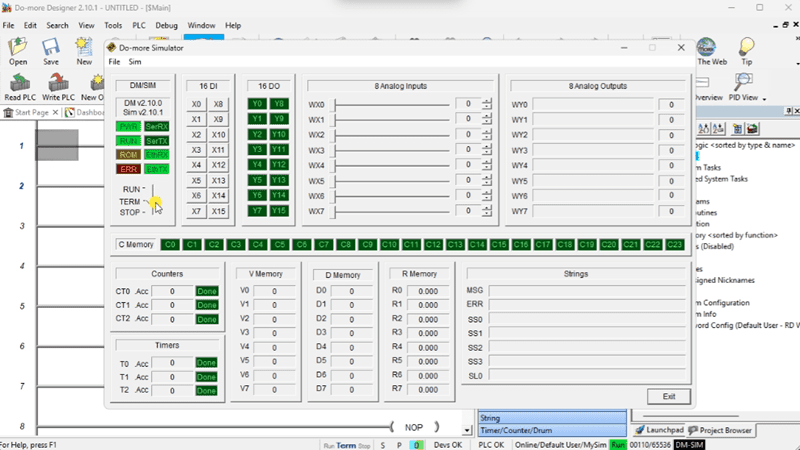 Do-More Series on how to use the Do-More Designer Software with the built-in PLC Simulator. This is a free, entire package that will also communicate through the Ethernet port of the computer running the PLC simulator.