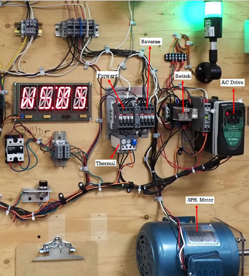In this workstation, the motor can receive commands from either of two contactors — named Forward or Reverse, one for each direction — or from a Variable Frequency Drive (VFD). The contactors run the motor at nominal speed only (1750 RPM in this example), while the VFD can vary the motor speed as programmed.