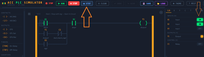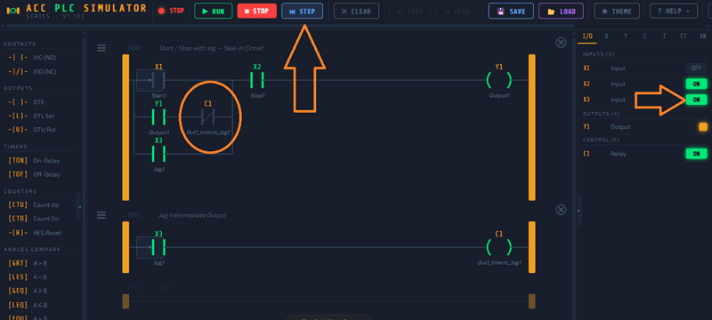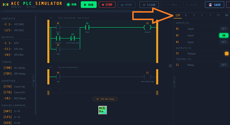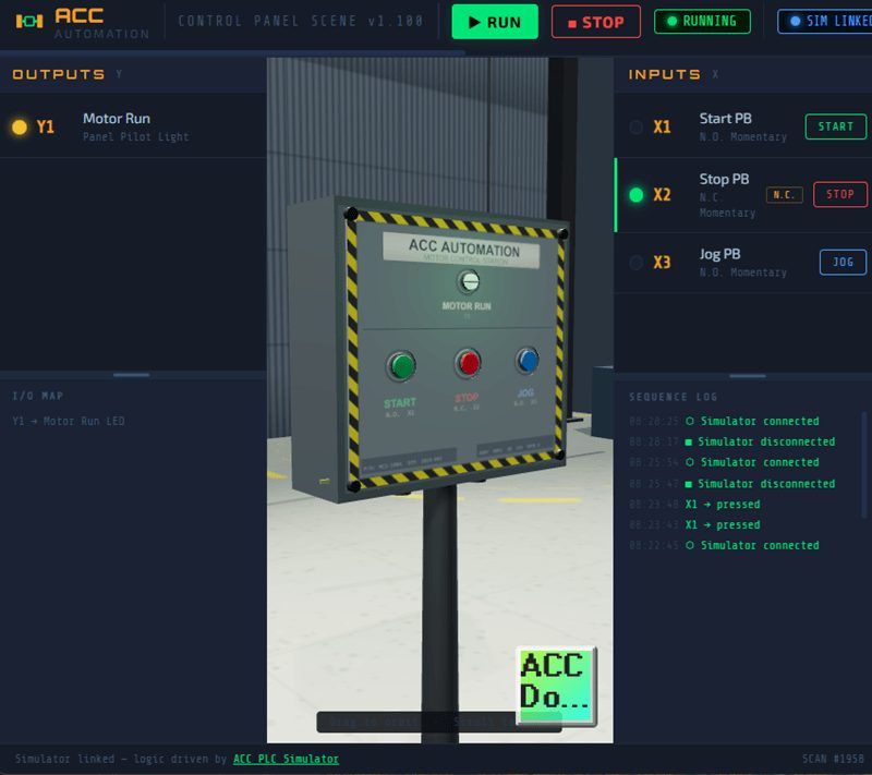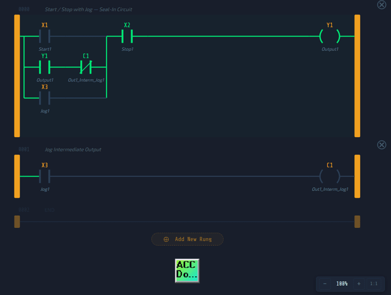 The ACC PLC Simulator is a browser-based ladder logic editor and scan engine. It supports: