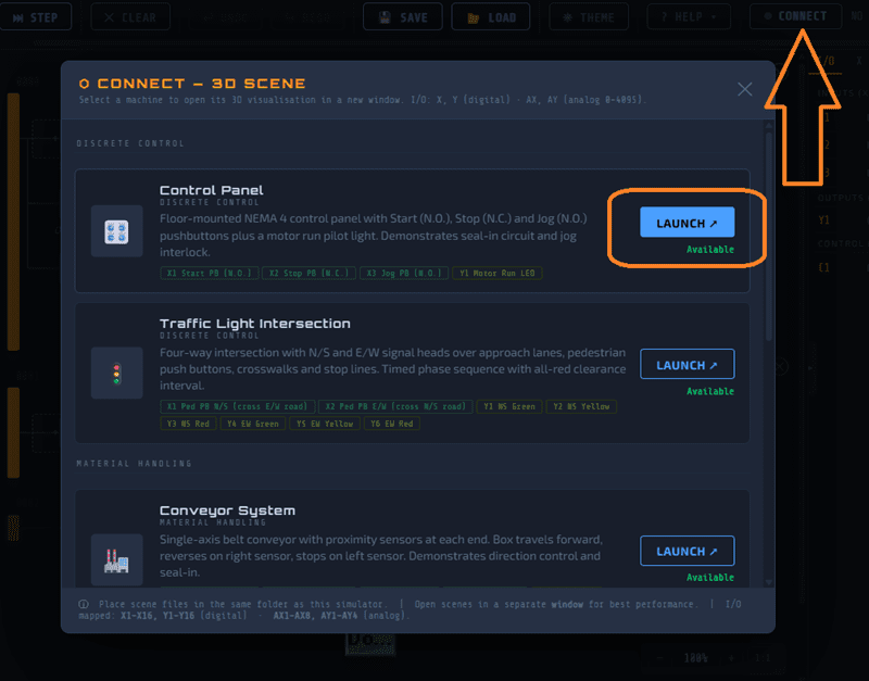 The simulator has more scenes coming — a Conveyor System, a Tank Fill Station, a Traffic Light Intersection, and a Pick & Place Palletizer are already available. More are in development. Each scene introduces different I/O patterns and control challenges.