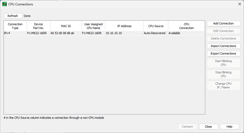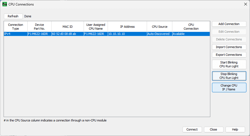Click on the Connect button. This will select the Ethernet port we want to use for programming the unit in our CPU connections window.