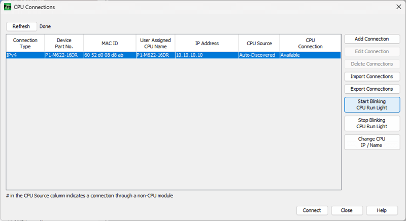 Click “Start Blinking CPU Run Light”. This will start the run light on the P1-M622-16DR unit blinking. It is a great way to ensure that we are communicating with the correct PLC unit.