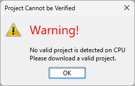 We currently have no project in our CPU, so a warning message is shown. Click OK.
