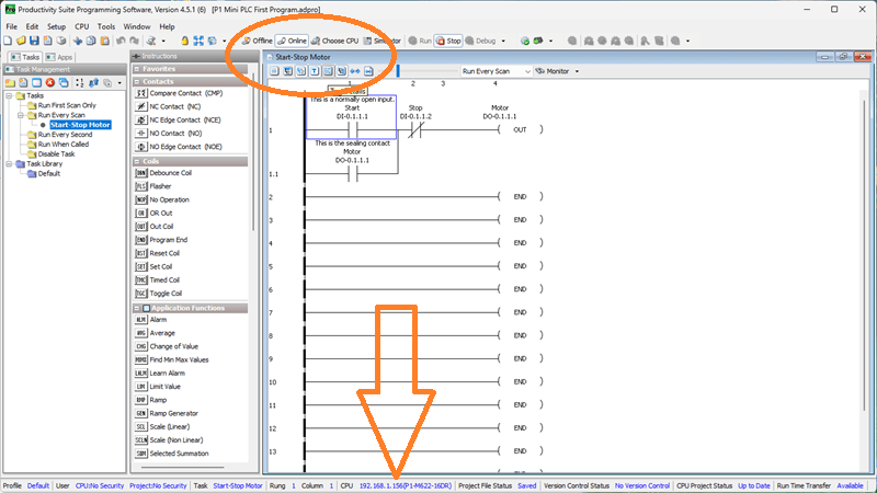 We can select the Tag Details and Instruction Comment icons on our ladder logic diagram. Select the Monitor icon on the Productivity Suite Programming software.