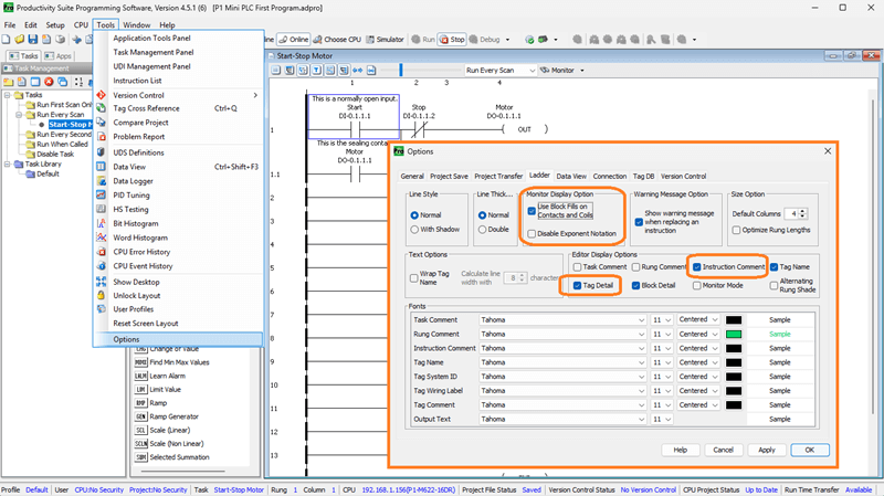 While in the ladder options menu, select Rung Comment and Tag Detail under Editor Display Options. This will automatically display the documented items when we open our project.