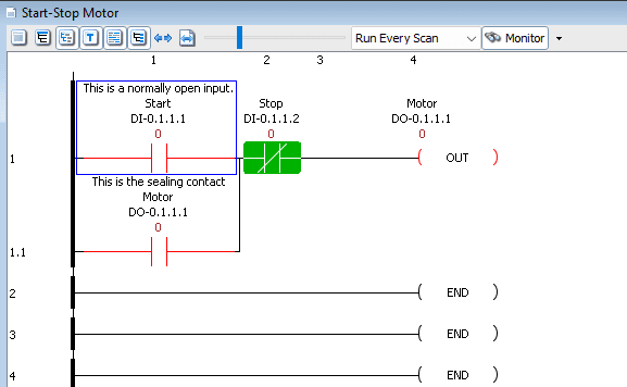 - The Motor output (DO-0.1.1.1) turns ON and seals in