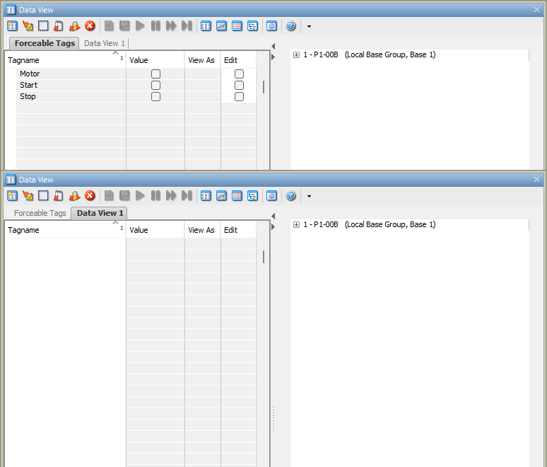 The Data View panel allows you to monitor and manipulate Tag values in the CPU. Multiple Data View tables (Tabs) can be made within a Data View window.