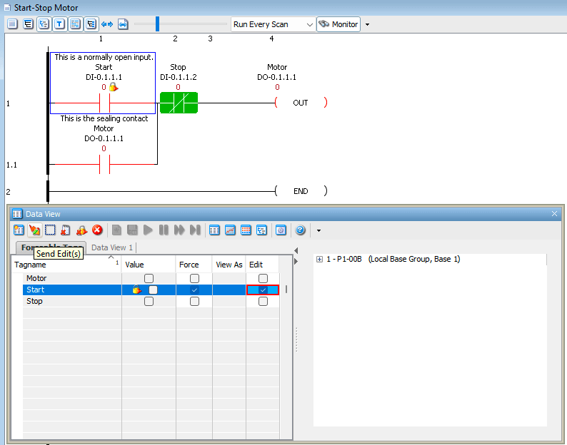 Click the Edit. This will instruct the software to change the status from on to off or off to on, depending on the current state of the bit being forced. In our case, the bit is off, so we want to force it on.