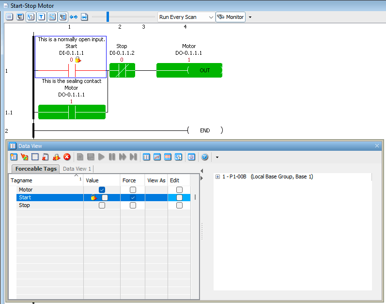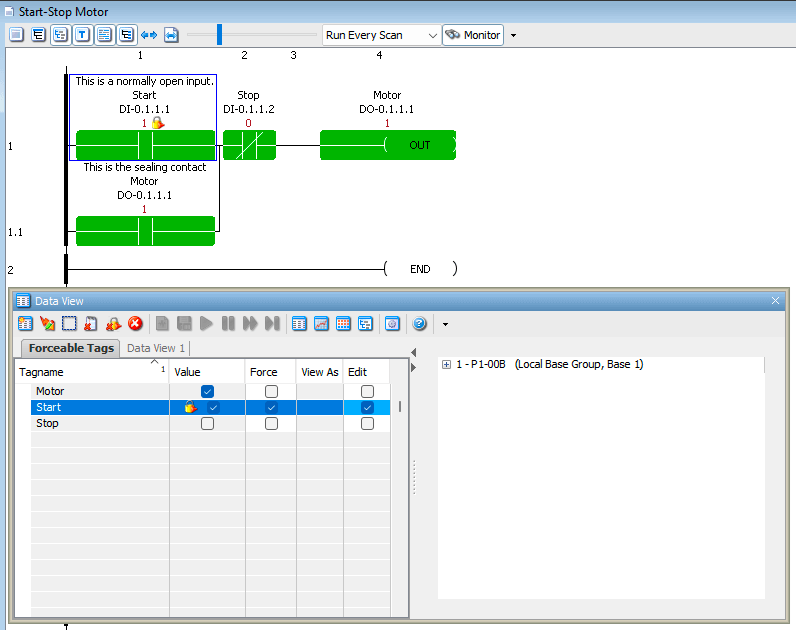 Our program will now display the forced bit, indicated by the lock icon, next to the contact. With the Start input forced ON, you will see: