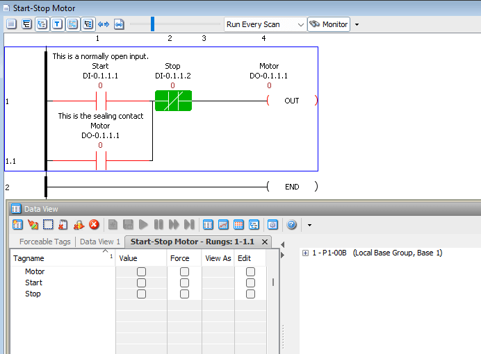 Our tag names for the rungs are displayed in a new Data View tab. For our start-stop circuit, this includes: