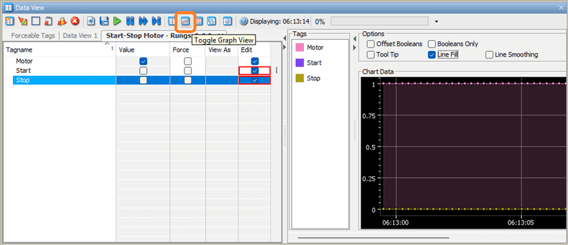 The Toggle Graph View option allows you to graph tag values. This is an excellent way of troubleshooting your PLC logic.