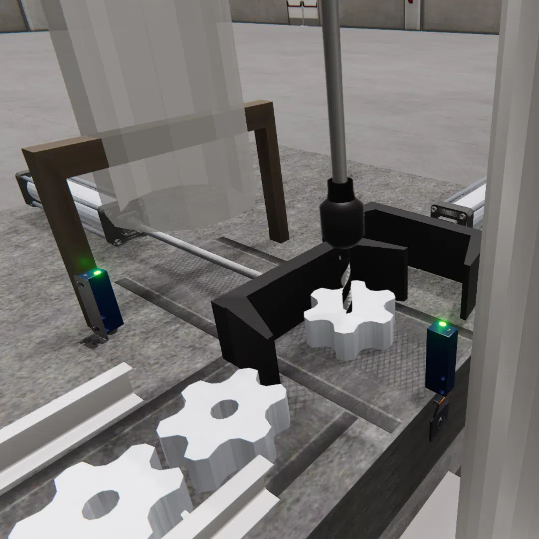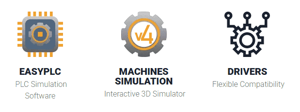 Machine Simulator – A virtual 3D world with real-time graphics and physical properties. PLC programs can be tested using the EasyPLC or through other interfaces. (Modbus RTU, TCP, etc.)